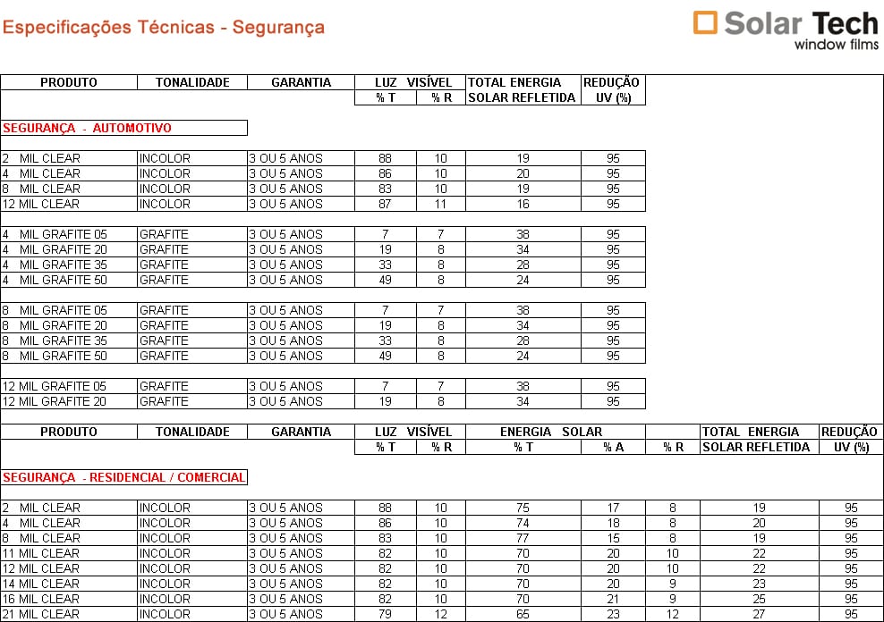 As películas Solar Tech são a opção econômica para a atualização de vidro. As películas de controle solar para vidro, linha segurança ou antivandalismo, são ideais para clientes que buscam segurança em seus automóveis e estabelecimentos comerciais.
